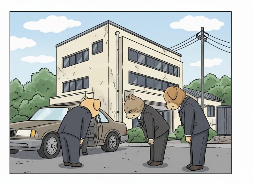 会社の自動ドアの前にはグループ会社の社員数名が整列しており、社長が来ると同時にフロア中に響き渡るような爆音で挨拶しながら頭を下げる。もはやどこぞの構成員である。