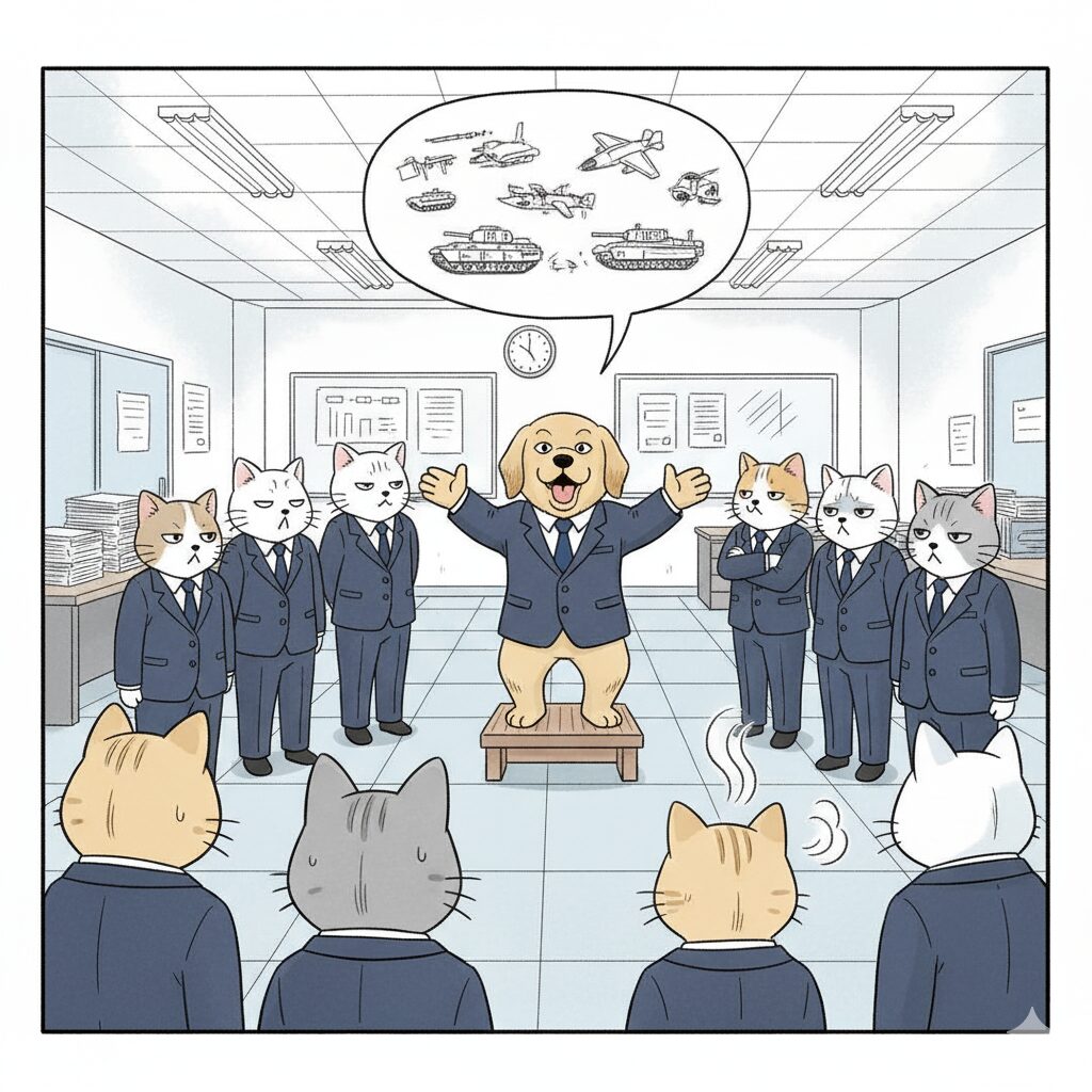 朝礼の中に、社長からひとことお言葉をいただく時間がある。これが朝礼の中で最も退屈で辛い時間である。加齢による物忘れが激しくなってきたためか、かなりの頻度で同じ話をするのだが、毎回新鮮な表情と口調で話をするので、私達も今初めて聞いたかのように演技しなければならない。主な内容は、中の国や北の国などの世界情勢の話や、戦争や武器の話が多い。軍事に興味があるらしい。実際に話をしている時間は10分程度だが、体感は3〜40分ほどである。たまに全く違うことを考えすぎて、一瞬記憶が飛んでしまうことがあるが、他の人に聞いたら皆同じ体験をしていた。